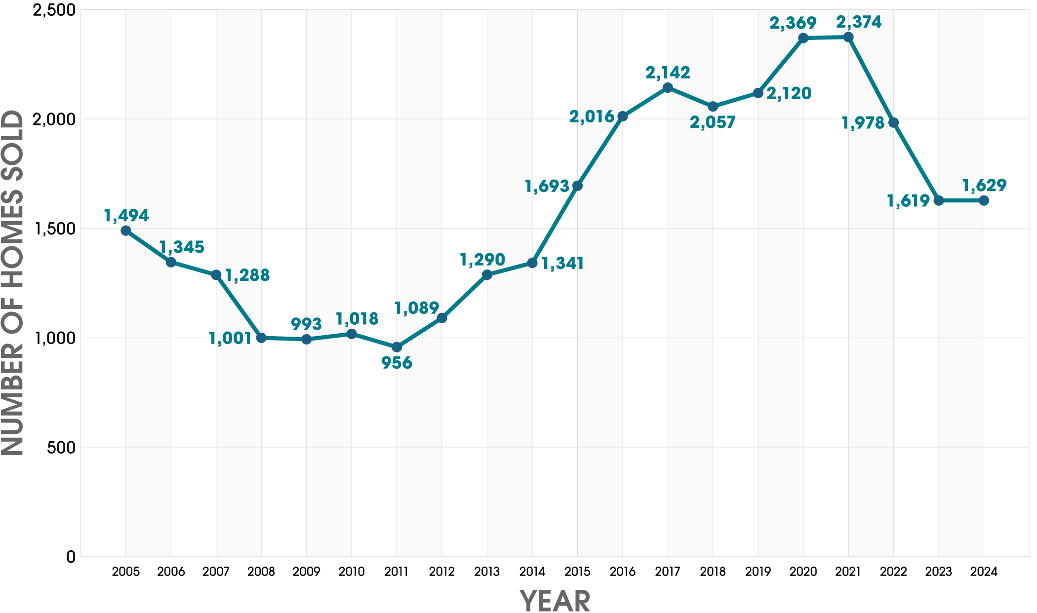 Existing single family home sales in Ulster County between 2011 and 2020 continued to increase as the economy continued to recover from the 2008 recession (Figure 4.11). A sharp decline was seen after the COVID-19 pandemic as home sales pulled back to mid-2010s levels due to increasingly rising sales prices and interest rates. The data shows a leveling out in 2024 as home sales increased slightly from 2023 after three straight years of sharp declines indicating an improvement. However, elevated sales prices remain challenging for residents, with the median sales price increasing by 47% between 2018 and 2023, from $262,000 to $385,000.