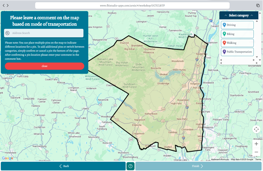 An interactive online workshop and survey allowed participants to identify specific locations where transportation infrastructure is working well or causing issues using an interactive pin drop map. In addition, users took part in a budgeting exercise, allocating resources to transportation priorities they’d most like to see improved.