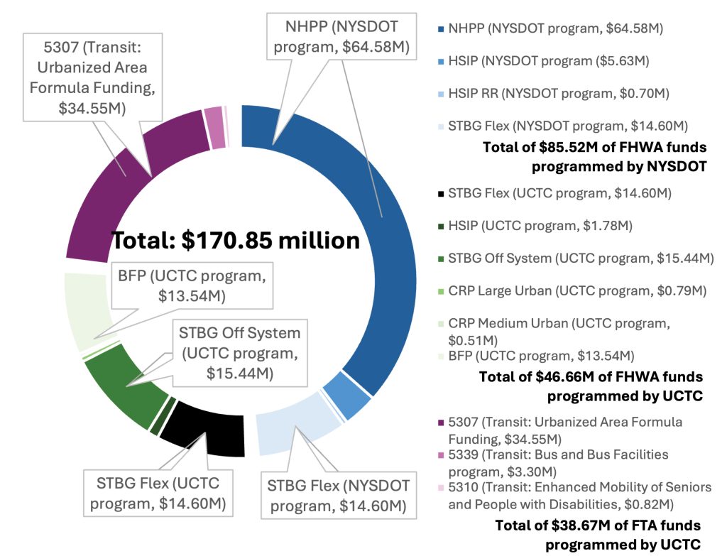 The Recommended Plan of Projects identified in the following pages is directly linked to the UCTC’s FFY 2026-2030 Transportation Improvement Program (TIP), to take effect on October 1, 2025. The TIP includes a priority list of proposed federal and state supported projects to be implemented after the initial adoption of the TIP. A detailed financial summary is provided in each iteration of the TIP. As shown in Figure 9.1, the UCTC 2026 TIP included over $170 million in federal aid to the Ulster County Metropolitan Planning Area over the five-year TIP period.