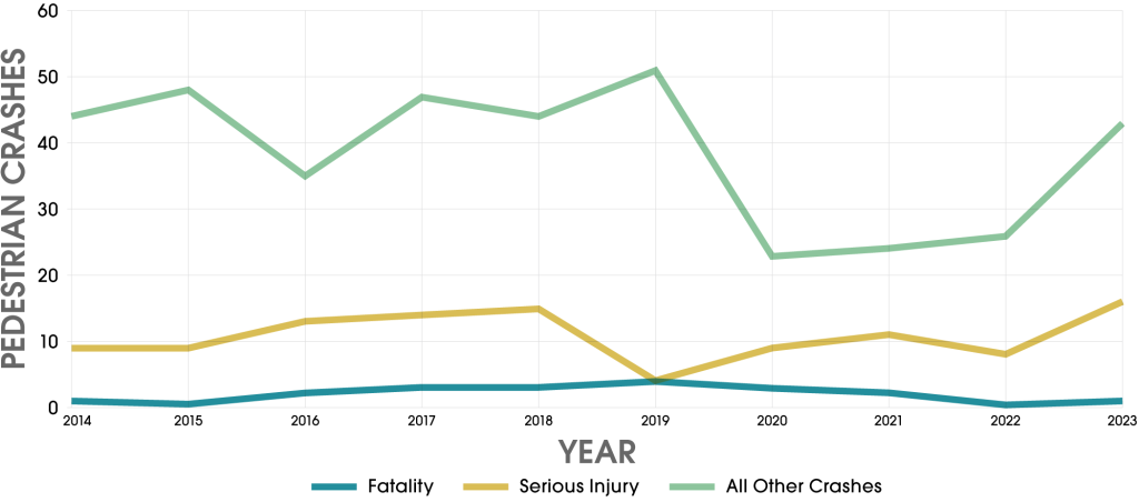 Pedestrian crashes sharply decreased to a 10-year low in 2020 at the onset of the COVID-19 pandemic, but began to rise again after 2022 consistent with statewide trends.