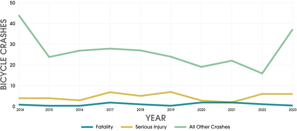 Bicycle crashes generally declined between 2017 and 2020 with a slight increase in 2021, followed by a peak 10-year low in 2022. Crashes then increased significantly to their highest levels since 2014.