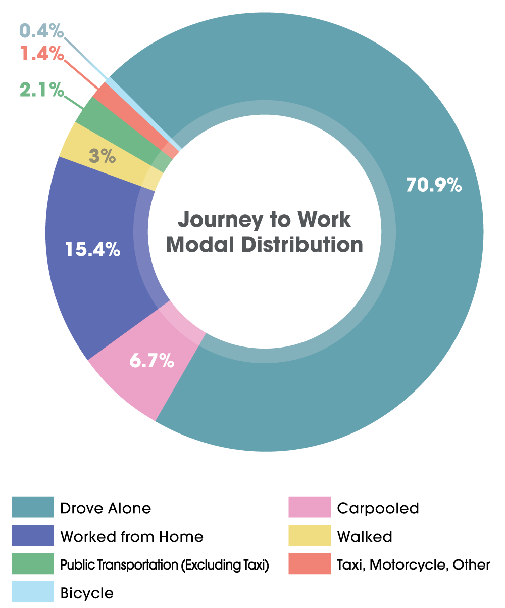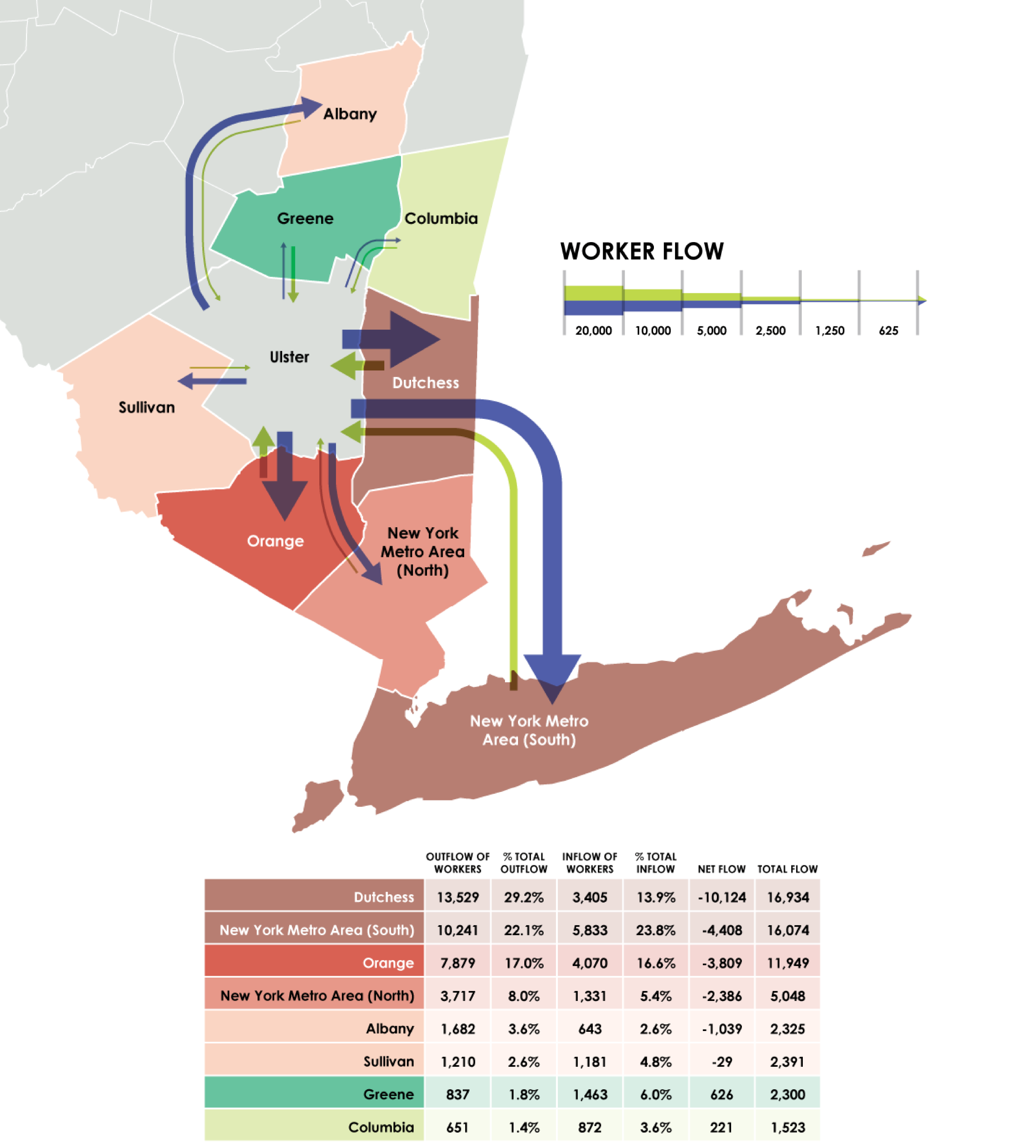 The TMA region’s workforce as a whole is on the move. While a large percentage of the workforce leave Ulster County every day (56%), both Dutchess (55%) and Orange (55%) experience similar commutation patterns. These flows have considerable impact on congestion and drive investments in transit, park- and-ride facilities, and corridor improvements.