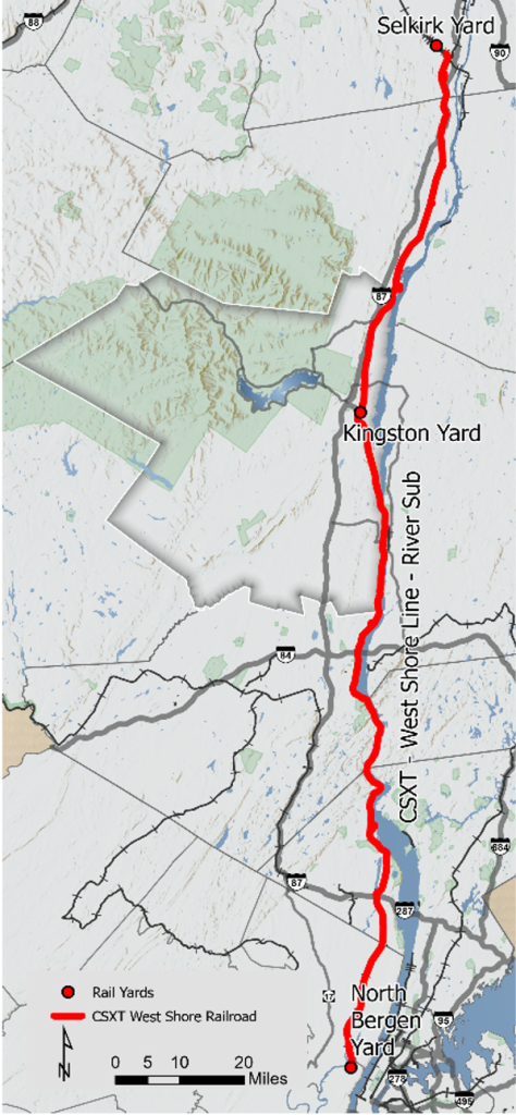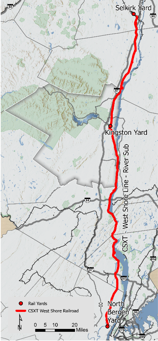 In terms of waterborne cargo, the Hudson River is also designated as “Marine Highway 87”. The harbors at Kingston and Saugerties utilize this highway as do docking facilities for oil transfer along the Hudson within Ulster County. CSX owns the only freight rail line in Ulster County, formerly known as the West Shore line which runs north-south along the Hudson River, connecting New York City to Albany.