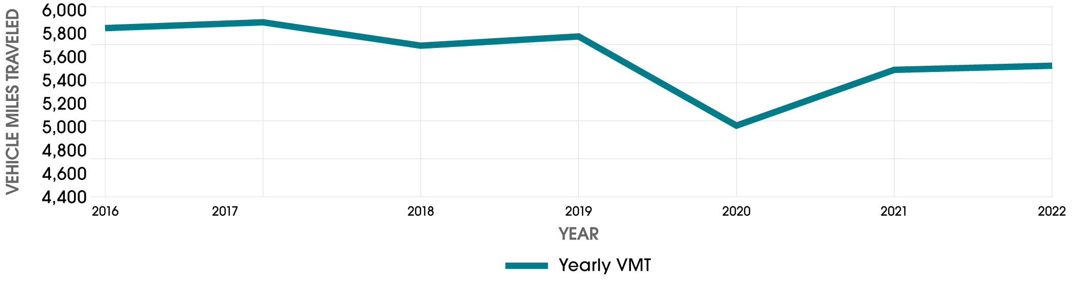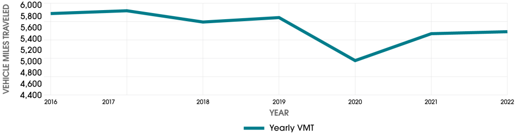 Prior to the COVID-19 pandemic, Vehicle Miles Traveled (VMT) in Ulster County remained relatively steady. Consistent with statewide and national trends, VMT decreased precipitously in 2020 but has since rebounded. That said, VMT has not yet reached the peak levels observed in 2018.