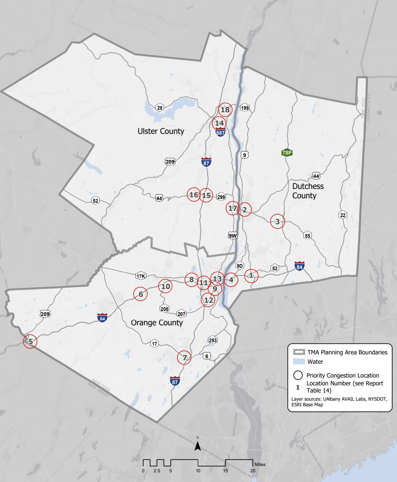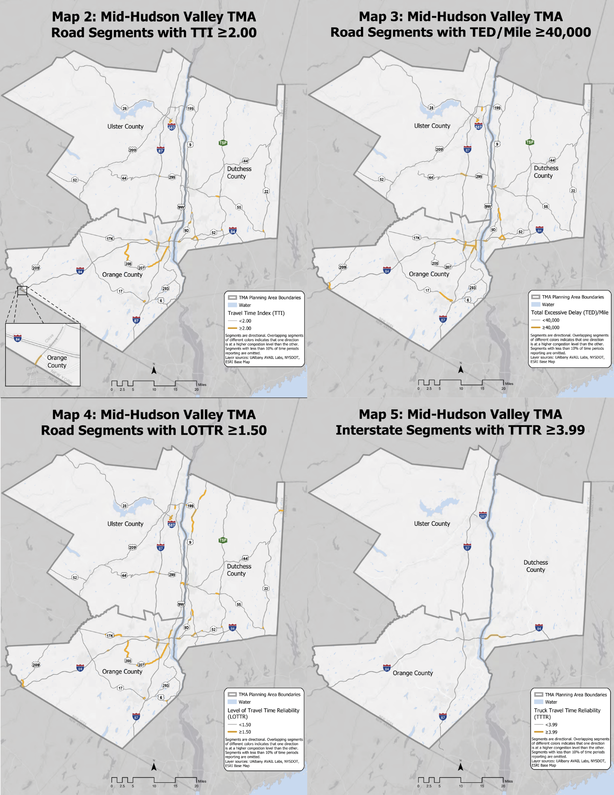 Congestion continues to be an issue that UCTC has worked to measure and define, locate, manage, and integrate and evaluate in the planning process. The Congestion Management Process (CMP), last completed in 2019, conducted macro analyses to identify key congested areas in the region on the National Highway System (NHS). These areas were identified using a number of congestion measures including Level of Travel Time Reliability (LOTTR), Truck Travel Time Reliability (TTTR), Travel Time Index (TTI), and Total Excessive Delay per Mile (TED/mile). Each of the congestion measures – LOTTR, TTTR, TTI, and TED/mile – employs a threshold of acceptability for road segments on the NHS. Table 5.10 provides a summary of NHS roadways in the Mid-Hudson TMA and their relation to the threshold values for the identified congestion measures.