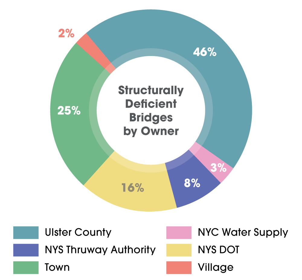 The Ulster County transportation system includes 393 functional bridges; 39% are county-owned structures, 28% are NYSDOT-owned structures, and 20% are locally-owned.