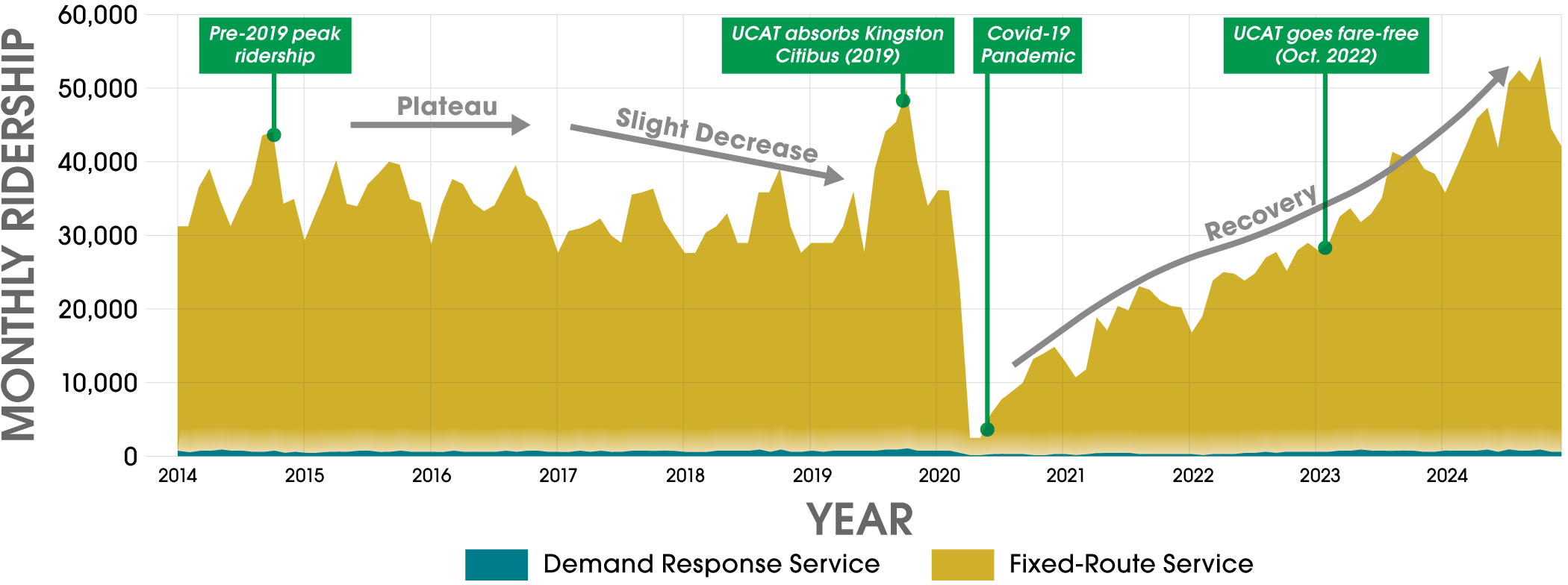 Since the pandemic, ridership has steadily increased with a slight uptick in rate of recovery following the shift to a fare-free system in October 2022. In fact, towards the latter half of 2024, ridership began exceeding the pre-pandemic peak. Since then, ridership has only continued to climb, with over 280,000 passenger trips provided in the first six months of 2025, a 12% increase over the number of passenger trips provided in the first half of 2024.