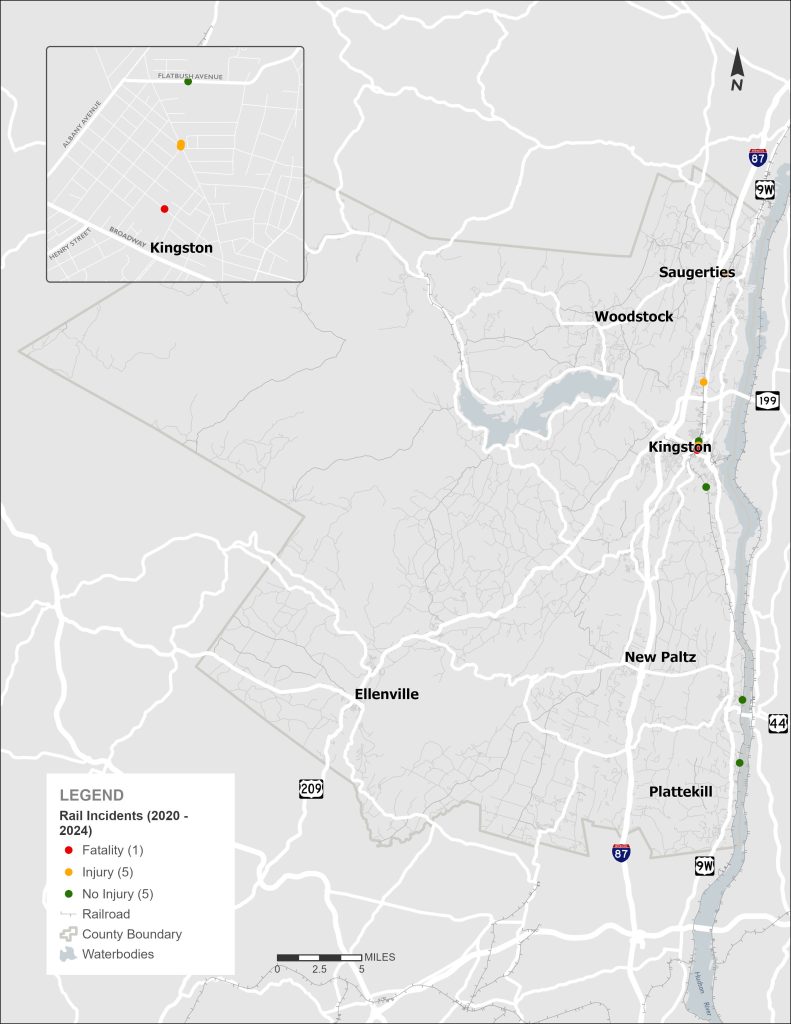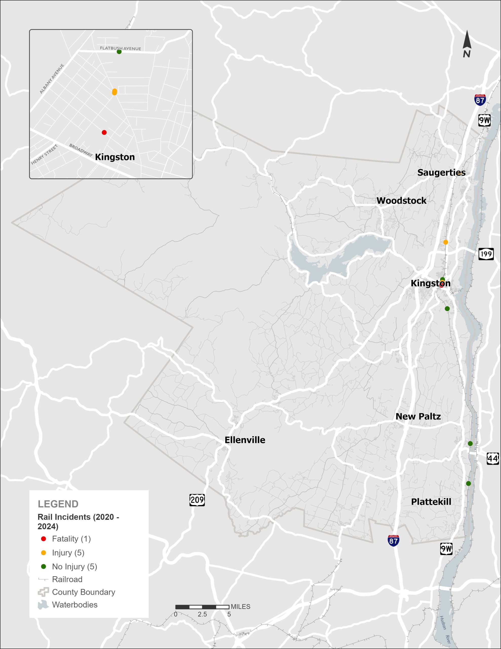 The issue of rail safety has become a topic of increasing concern among residents and officials, after several tragic collisions between CSX trains and automobiles and pedestrians in Saugerties and the City of Kingston. From 2020 to 2024 there have been 11 grade crossing incidents in the UCTC planning area, or approximately two incidents per year. These incidents resulted in one fatality and five injuries.