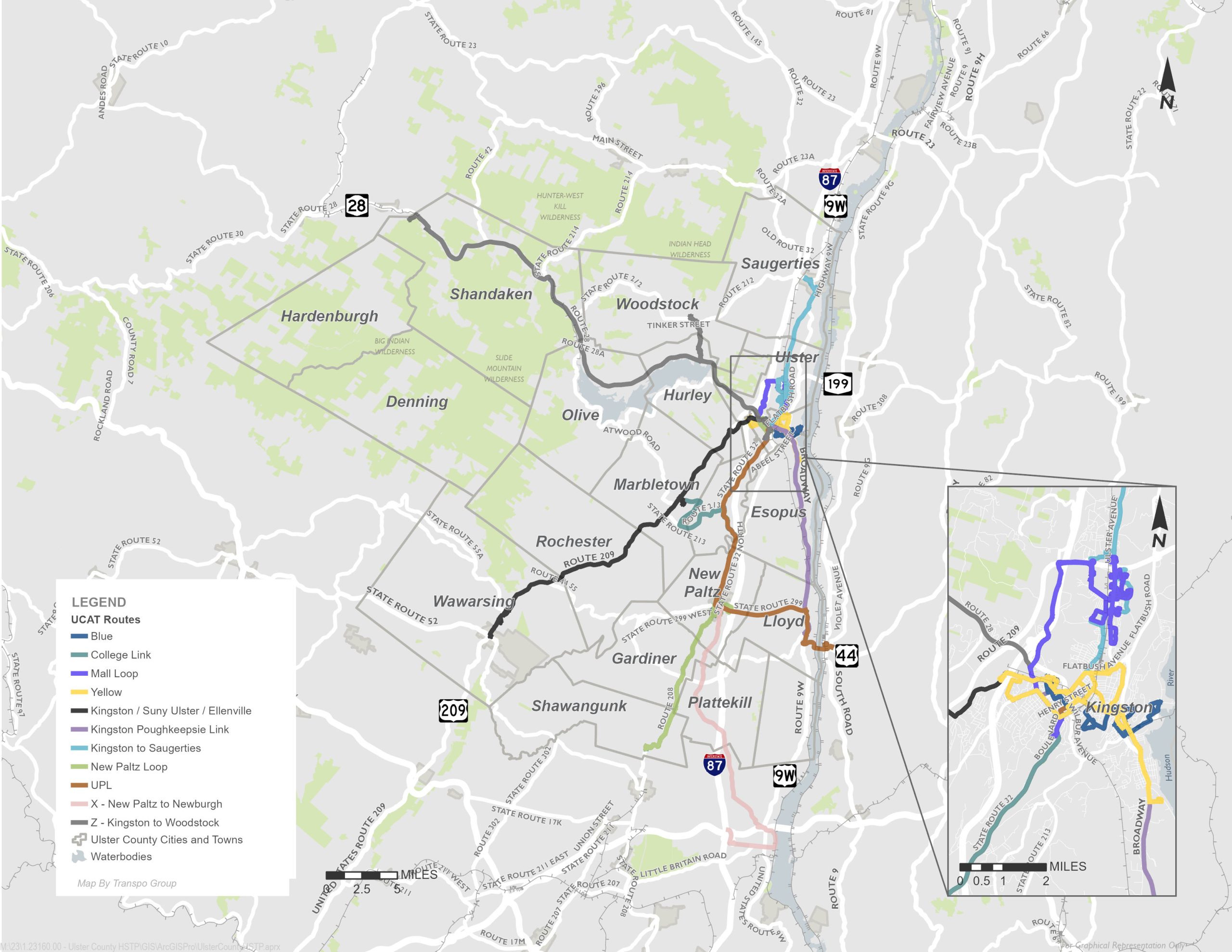 Ulster County Area Transit (UCAT) presently operates a total 11 scheduled fixed routes throughout Ulster County and three specialty routes. UCAT also offers rural route services by request to passengers in the rural areas of the county. Passengers who are 60 years or older and registered with the Office for Aging are eligible for one round trip for shopping and two round trips for medical service per week free on the UCAT system or the Office for Aging medical van. UCAT is currently partnering with UCTC to study how the existing UCAT system can be transformed to better serve the public.